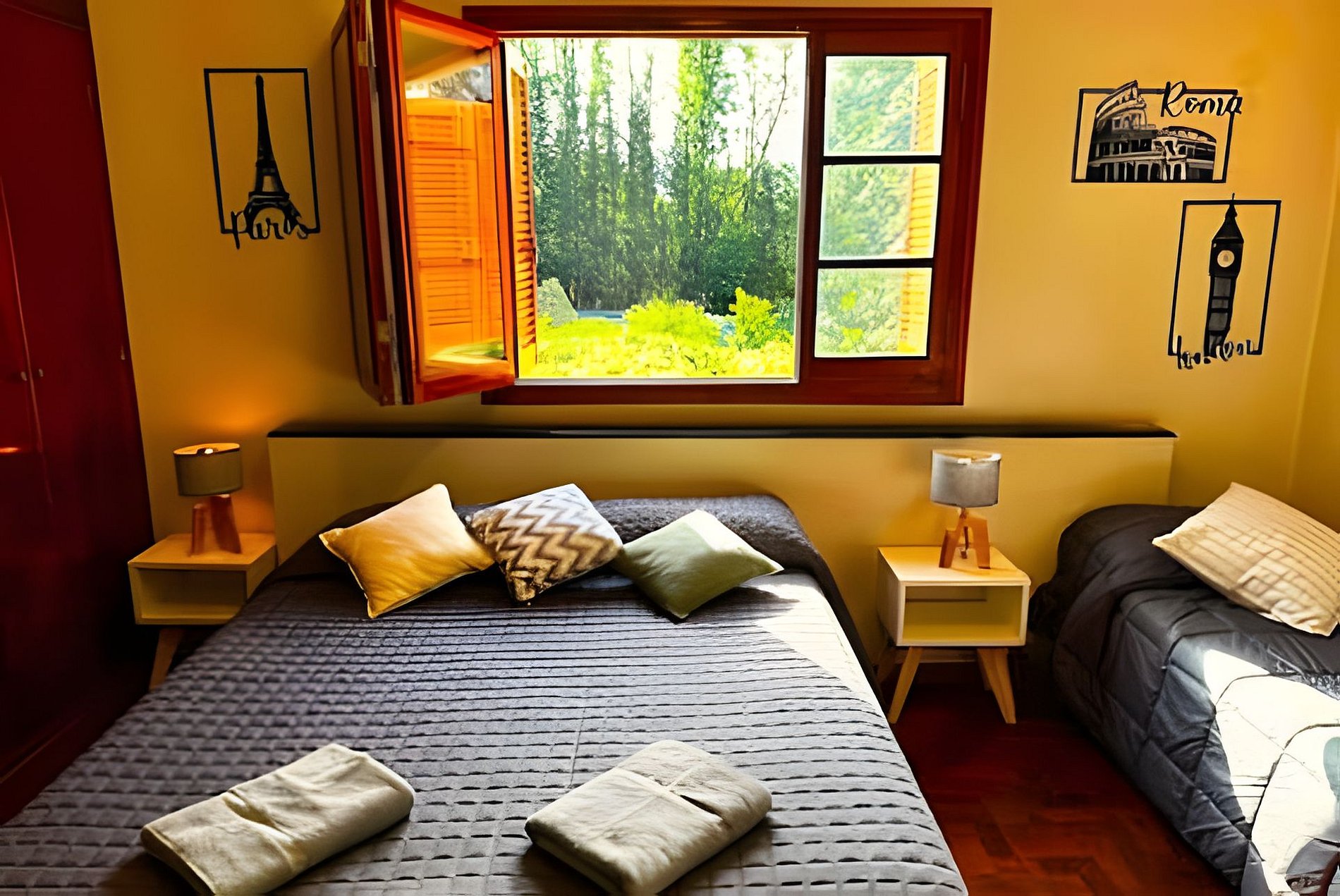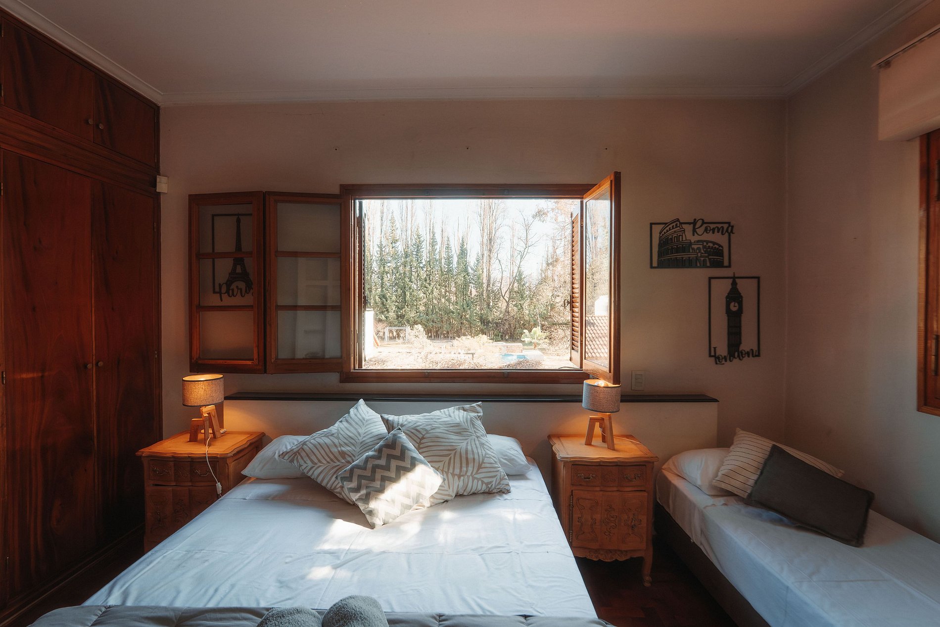 Te ofrecemos una habitación principal, con espacios comunes ideales para desayuno y lectura . Es un ambiente muy amplio, confortable. Contamos con internet de alta velocidad(1000mb), espacios para comer y disfrutar del jardin. La habitación cuenta con: Baño privado, sabanas y toallas de primera calidad, acceso a balcon/patio y 3 camas individuales(tenemos posibilidad de armar una cama queen también preguntar previamente)