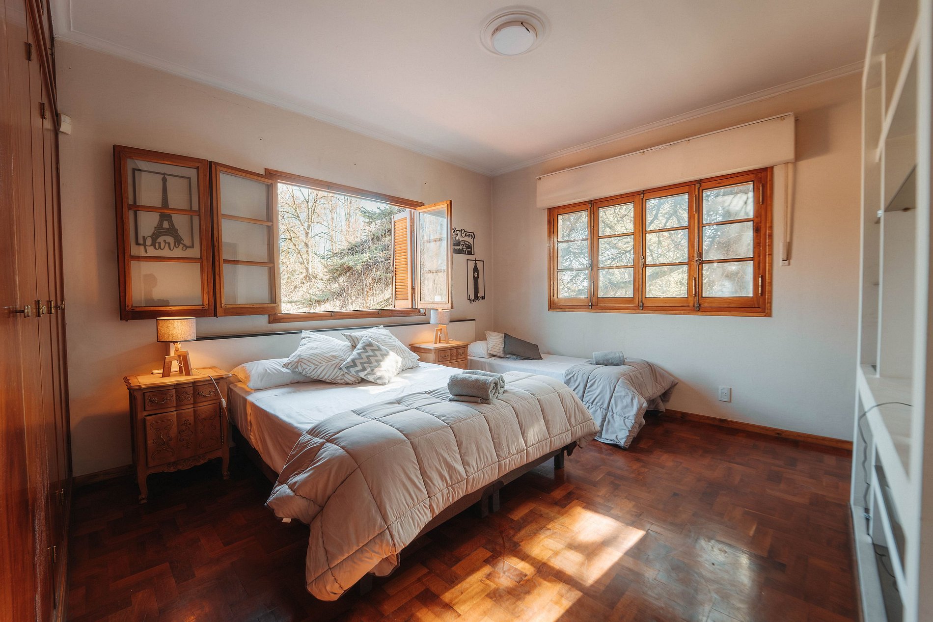 Te ofrecemos una habitación principal para 4 personas, con espacios comunes ideales para desayuno y lectura . Es un ambiente muy amplio, confortable. Contamos con internet de alta velocidad(1000mb), espacios para comer y disfrutar del jardin. La habitación cuenta con: Baño privado, sabanas y toallas de primera calidad, acceso a balcon/patio y 4 camas individuales(tenemos posibilidad de armar una cama queen también preguntar previamente)
